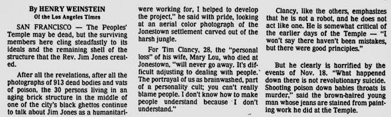 December 15, 1978, Register-Guard [Eugene, Ore.] Los Angeles Times, page 4D, Temple Survivors Still Cling To Jones' ideals, teachings, by Henry Weinstein,